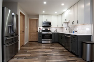 Prepare your meals or snacks in this well stocked kitchen. There is space for two people to sit to socialize or eat in the kitchen at the island.