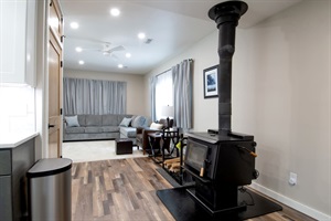 The electric reclining sectional is a comfortable place to put your feet up. Here you can relax in the glow of the LED candles or wood stove.. Contact host if you want to know if the weather would be conducive to using the wood burning stove.