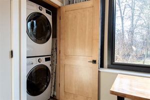First floor bathroom with washer, dryer, iron and ironing board. Laundry detergent provided.